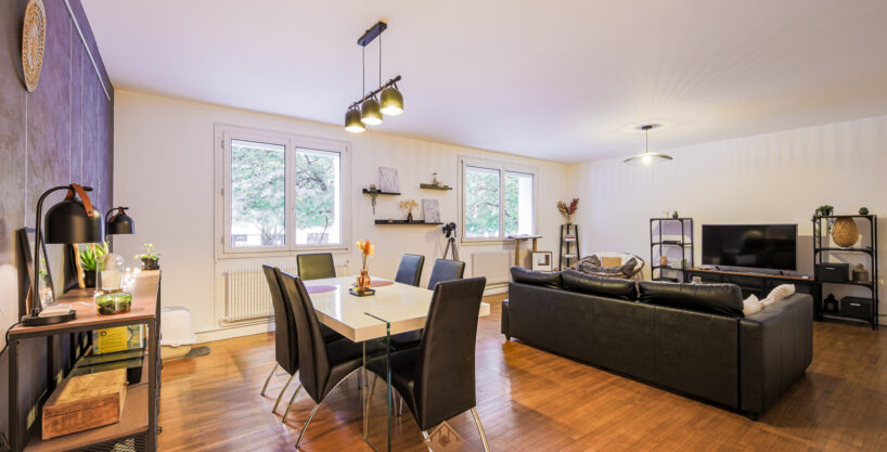 Le bien dispose d’une vaste entrée avec rangements, une pièce de vie de 38m2, une cuisine séparée et entièrement équipée donnant sur le balcon, 2 chambres côté cour, une salle d’eau et un WC indépendant.