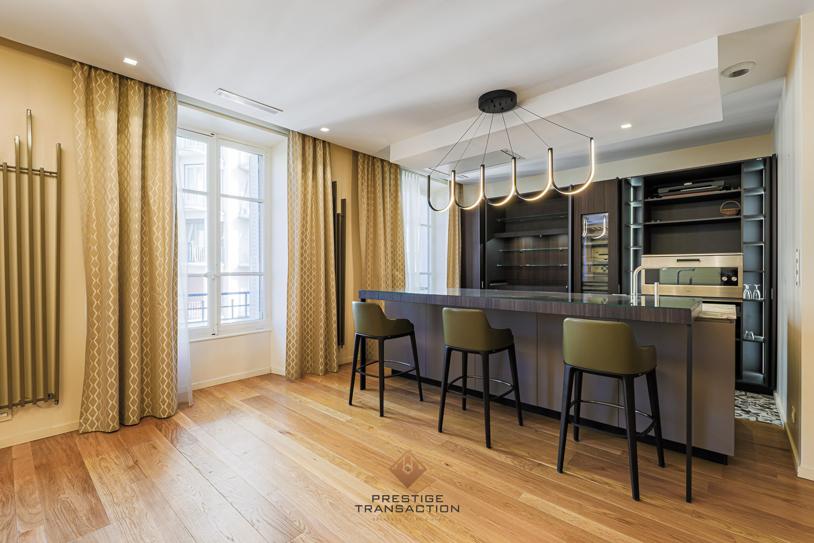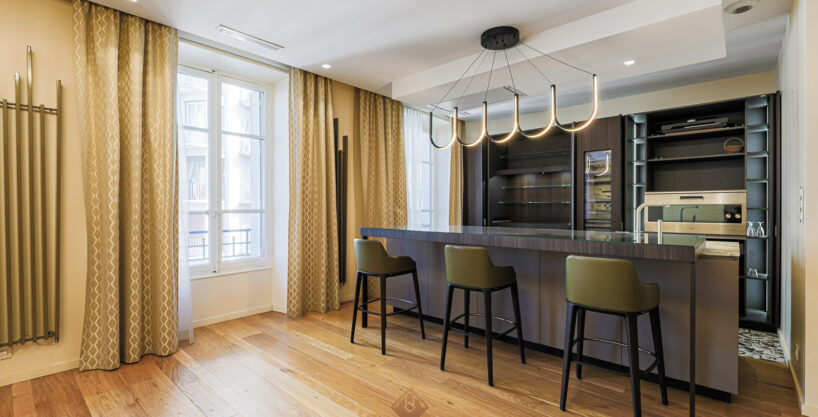 Equipements : Cuisine haut de gamme entièrement équipée (électroménager Gaggenau), climatisation gainable réversible, double vitrage, isolation intérieure, ballon d’eau chaude extra-plat, porte blindée, radiateurs design.