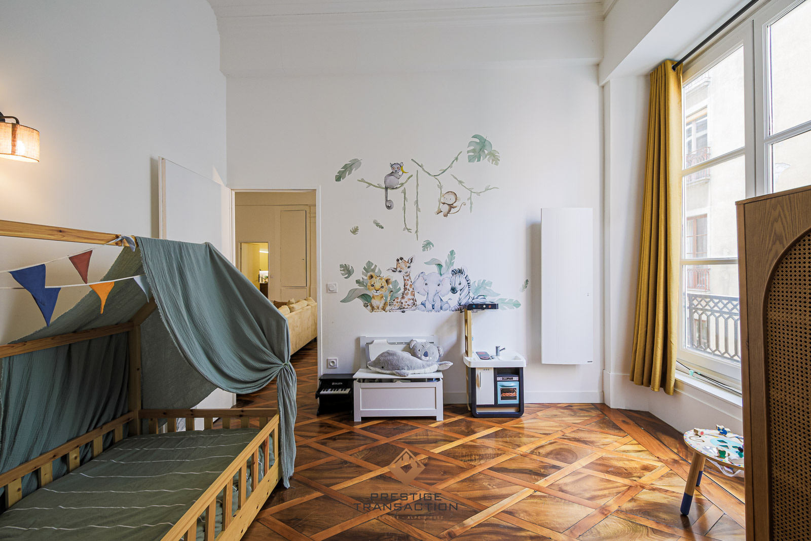 Vous serez séduit dès l’entrée par son superbe parquet et ses volumes généreux, avec une pièce de vie de 43 m2 sublimée par une hauteur sous plafond de 3,50 m. La cuisine américaine, est entièrement équipée, elle s’intègre parfaitement à l’espace.