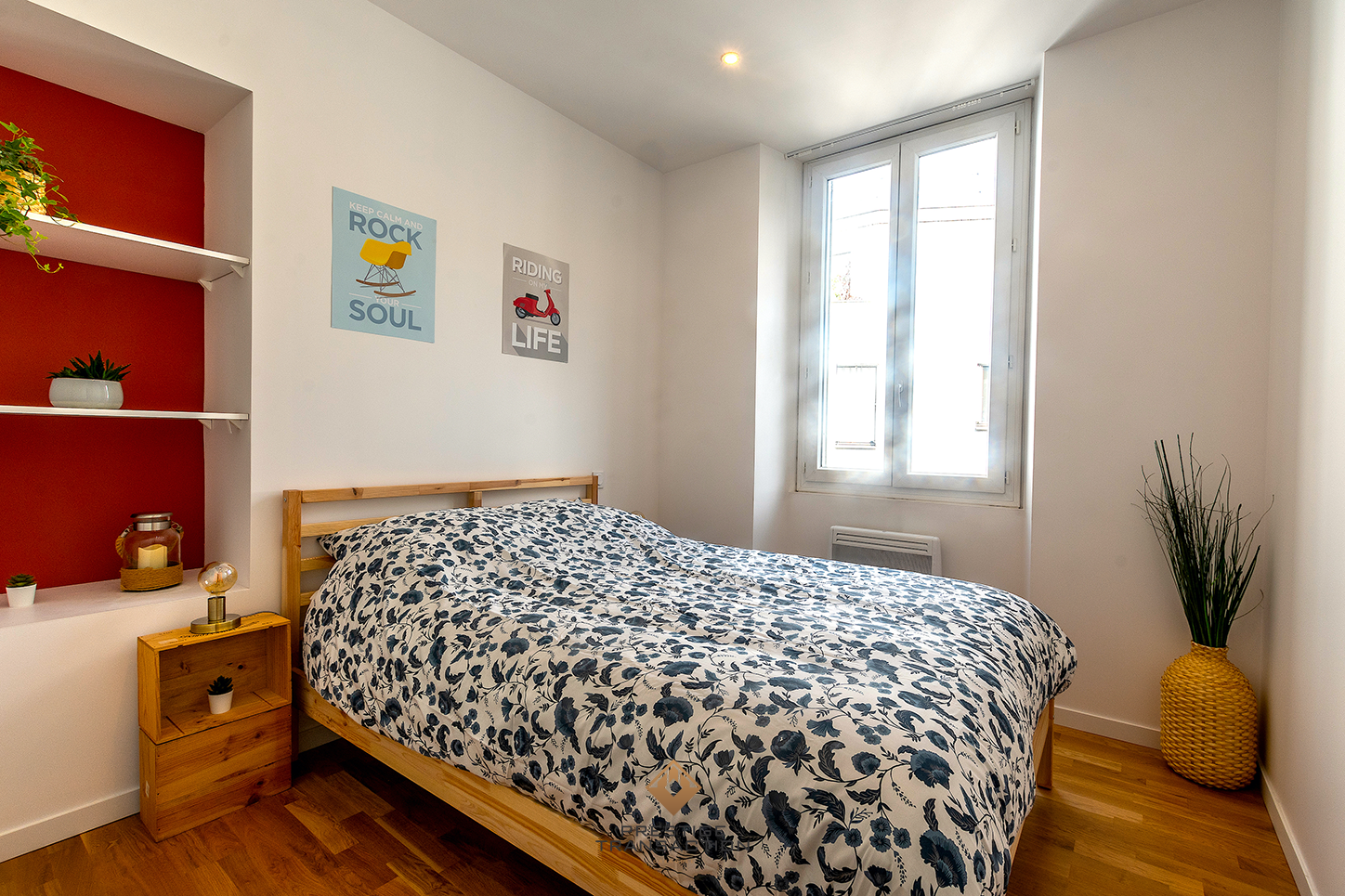Il se compose d’un hall d’entrée donnant sur vaste séjour avec sa cuisine ouverte, une chambre calme donnant sur la cour intérieure de l’immeuble, une salle de bains et un WC séparé.
