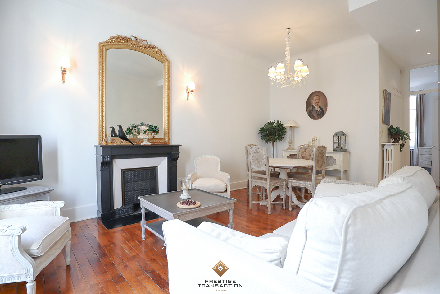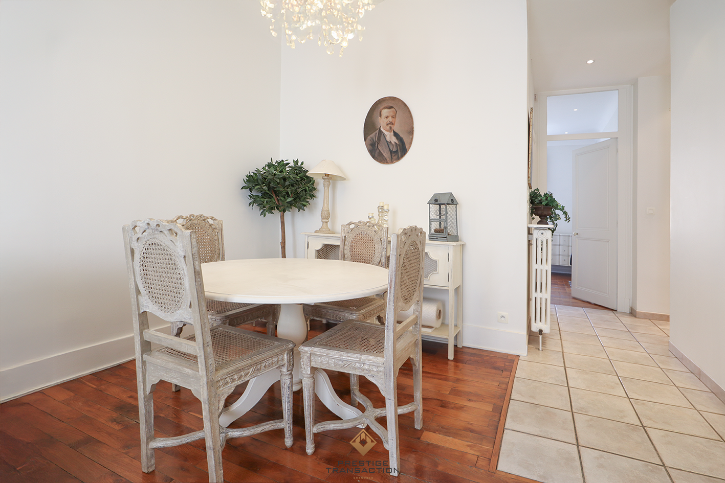 La pièce de vie se compose d’un espace salle à manger et d’un agréable salon, agrémenté d’une seconde cheminée qui apporte un charme supplémentaire à l’appartement.