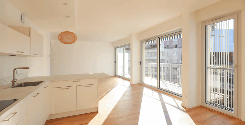 L’espace de vie baigné de lumière de 44 m2 se compose d’un salon avec cuisine ouverte , donnant accès à une terrasse de 8 m2 orientée Sud/Ouest avec vue sur les montagnes.