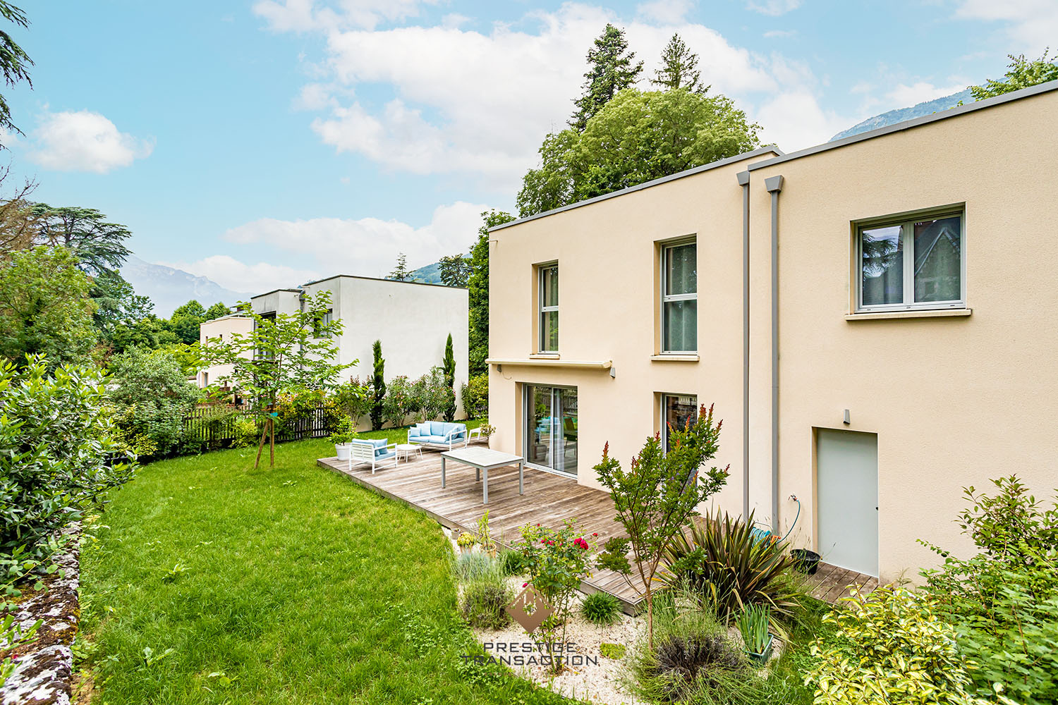 Bâtie en 2018 avec les normes RT 2012, la maison se compose d’un rez-de-jardin ouvert par de grandes baies vitrées sur une terrasse en L et un écrin de verdure paysagé.