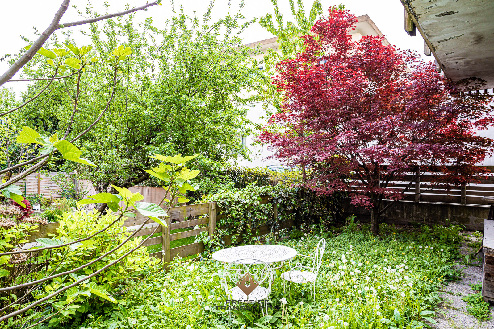 Maison entourée de jardin, parcelle de 319 m2 + espace jardin de 270 m2 avec accès direct sur les berges de l’Isère et appentis pouvant être transformé en garage.
