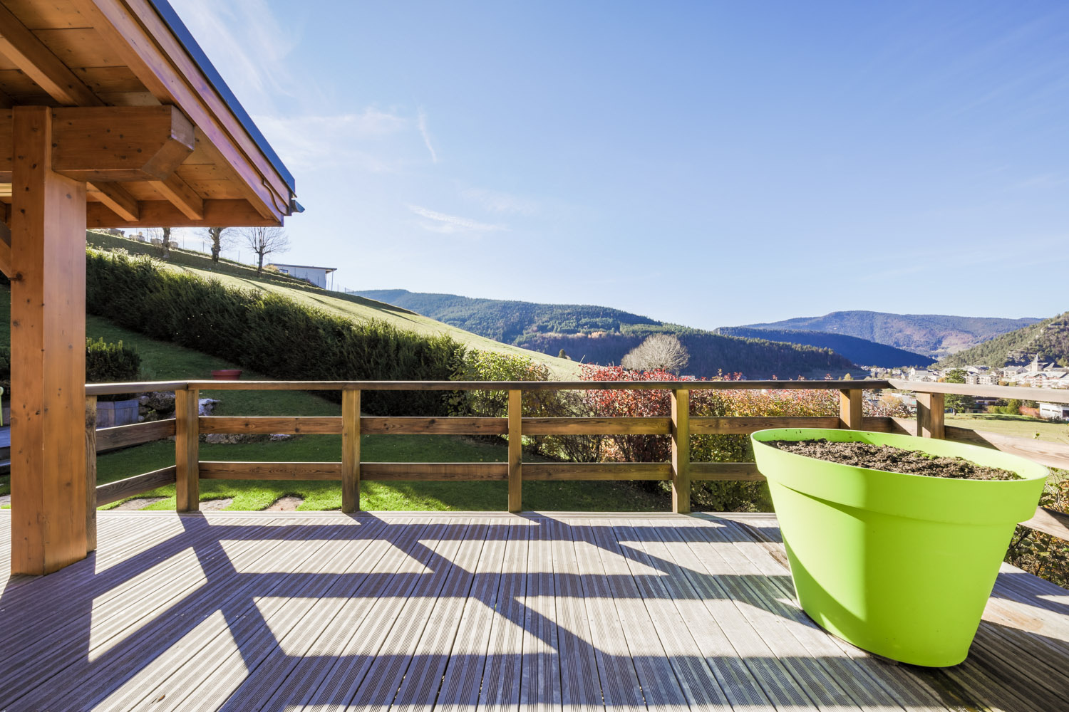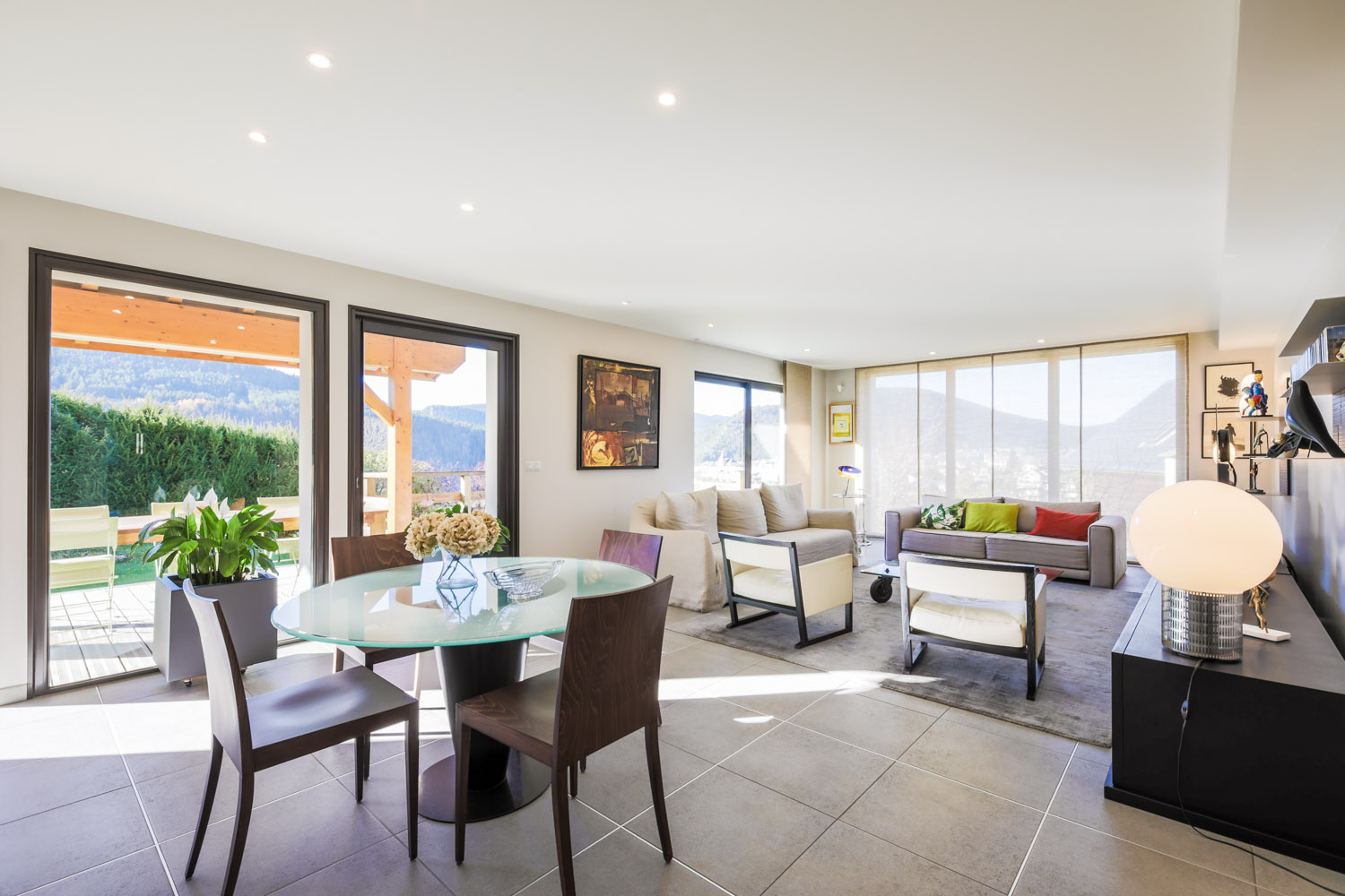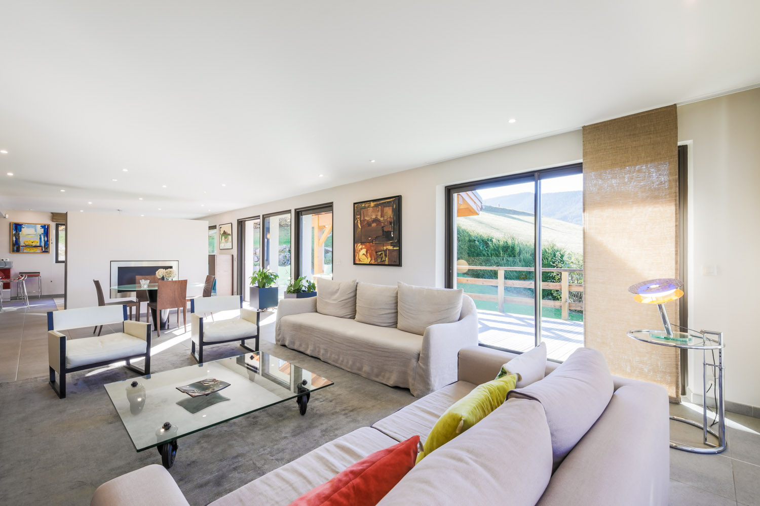 Spacieux séjour donnant sur une terrasse avec jacuzzi et vue montagne.